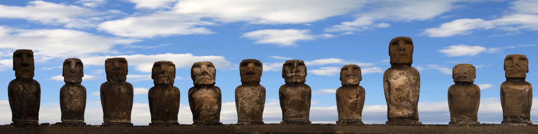 Iets verderop ligt Ahu Tongariki, het grootste ceremoniële platform van Rapa Nui. Hier staan vijftien Moai strak in het gelid. Dit indrukwekkende platform is in de jaren negentig volledig gerestaureerd, nadat een enorme vloedgolf in 1960 de loodzware beelden meters landinwaarts had gesleurd.